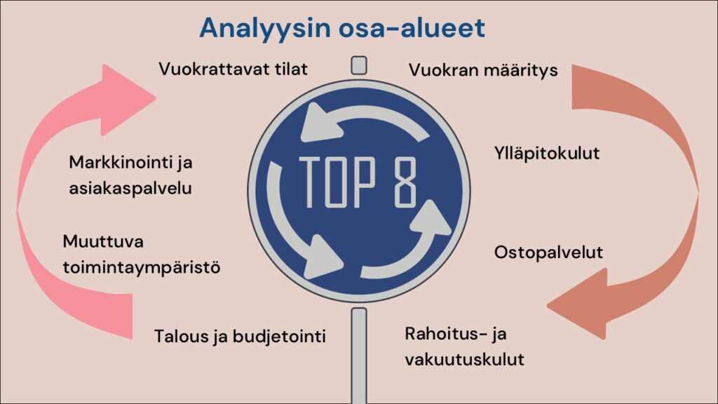 TOP8 -skenaariotyökalu tekee kattavan analyysin vuokrataloyhtiön nykytilanteesta ja luo selkeän tiekartan kohti parempaa tulevaisuutta. Analyysi selvittää yrityksen menestystekijöiden tämänhetkisen tilanteen ja antaa selkeät ohjeet riskitekijöiden korjaamiseksi. Tiekartta määrittää selkeän reitin kohti toivottua määränpäätä ja luotsi auttaa tarvittaessa pysymään valitulla reitillä.